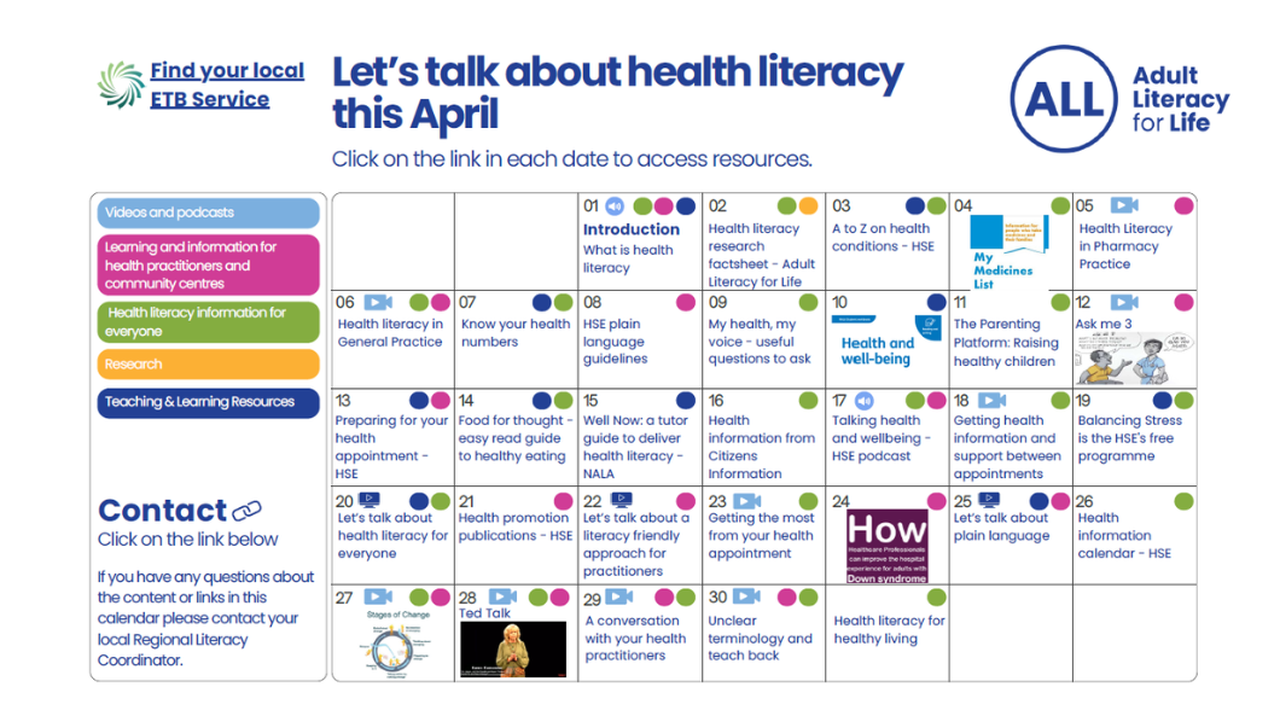 We are delighted to present our new calendar style interactive resource for health literacy. You can click on a new item each day to access information, resources and tips.